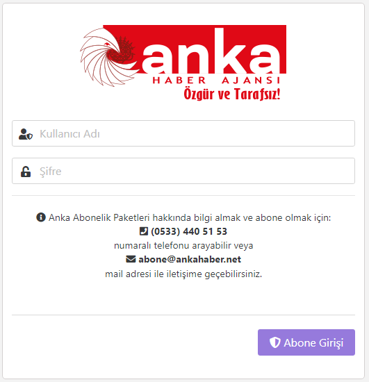 Bu sayfada Anka Haber Ajansı'nın size vermiş olduğu kullanıcı adı ve kullanıcı şifresi bilgileriyle giriş yapabilirsiniz