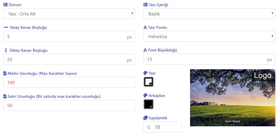 Otomatik Yazılar için öncelikli olarak yazının pozisyonunu ve kenar boşluklarını ayarlamamız gerekiyor. Sonrasında ise resim üzerinde gözükecek olan metin uzunluğunun maksimum kaç karakter olacağını belirtmeliyiz. Ayrıca 1 satırda kaç karakter olması gerektiğini de bu alandan belirliyoruz. Daha sonra yazı içeriğini belirtmek gerekiyor. Yazı içeriği;