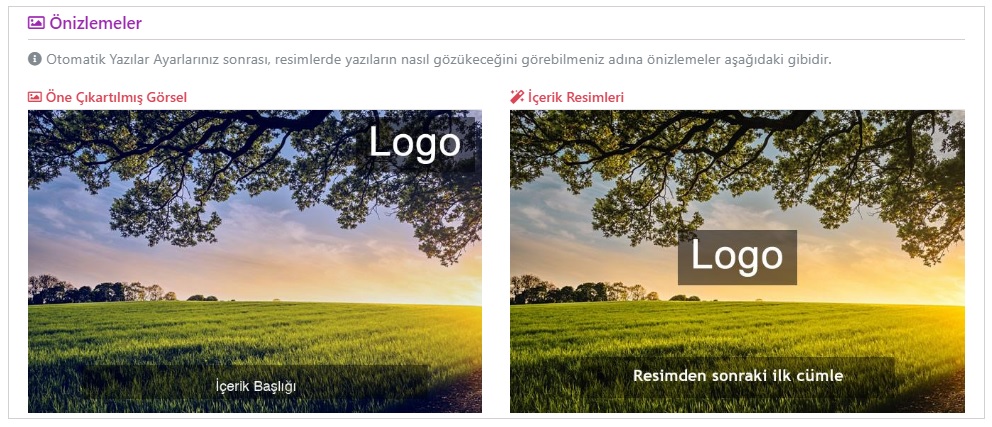 Bu sekmede; öne çıkartılmış görsel ve iç resimlerde, resim üzerine yazı eklemeniz için geliştirdiğimiz Otomatik Yazılar fonksiyonlarına erişebilirsiniz.