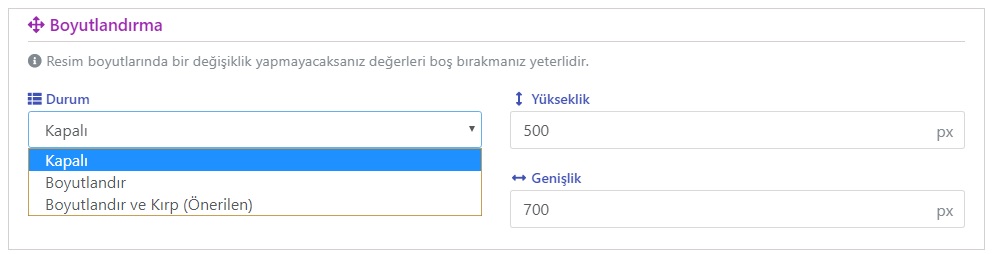 Boyutlandırma: Resimleri belirtilen boyutlara sıkıştırmak veya genişletmenin yanı sıra istenilen boyuta en uygun kırpma ile ulaşabilmeniz için Boyutlandır ve Kırp özelliğini de kullanabileceğiniz fonksiyon grubudur.