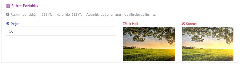 Filtre: Parlaklık: Resimlerde özgünleştirme için kullanabileceğiniz bu filtrede; küçük derecelerle aydınlık / karanlık vermenizi tavsiye ederiz. Ayrıca ek bilgi olarak; -255'in tam karanlık ve +255'in tam aydınlık değerler olduğunu da bilmekte fayda var.