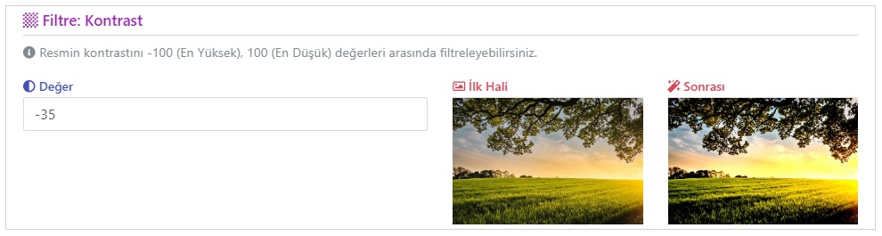 Filtre: Kontrast: Resimlerde özgünleştirme için kullanabileceğiniz bir diğer filtre de kontrast ayarıdır. -100 ile +100 (Gri) arasında değerler verebileceğiniz bu filtrede çok küçük değerlerde vereceğiniz konstrat değerleri oldukça yararlı olacaktır.