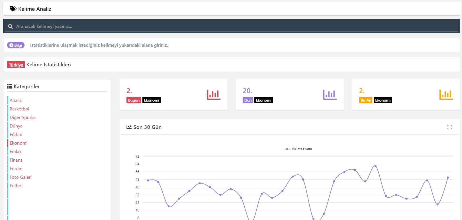 Kategori bazlı olarak; her kelimenin popülerliğini hesaplamak için çeşitli algoritmalar ile geliştirmiş olduğumuz Kelime Analiz Sisteminde sektörel olarak takip olanağı sağlanmaktadır. Son 30 günlük verilere ulaşabileceğiniz bu sistem ile istediğiniz kelimeleri kontrol altına alabilirsiniz.