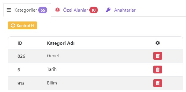 Sitenizde kategori değişiklikleri yaptığınızda veya yeni kategori eklediğinizde Site Ayarlarında, Kategoriler sekmesinde Kontrol Et butonuyla bu değişik / yenilikleri WBots'a aktarabilmektesiniz ancak daha önceden eklediğiniz herhangi bir kategoriyi sitenizden sildiğinizde bu kategori WBots'ta silinmemekteydi ve bunun için destek talebi oluşturmanız gerekmekteydi. Versiyon 1.49 ile birlikte Site Ayarlarınızdan artık istediğiniz kategorileri bir buton sayesinde sistemden kaldırabiliyorsunuz.